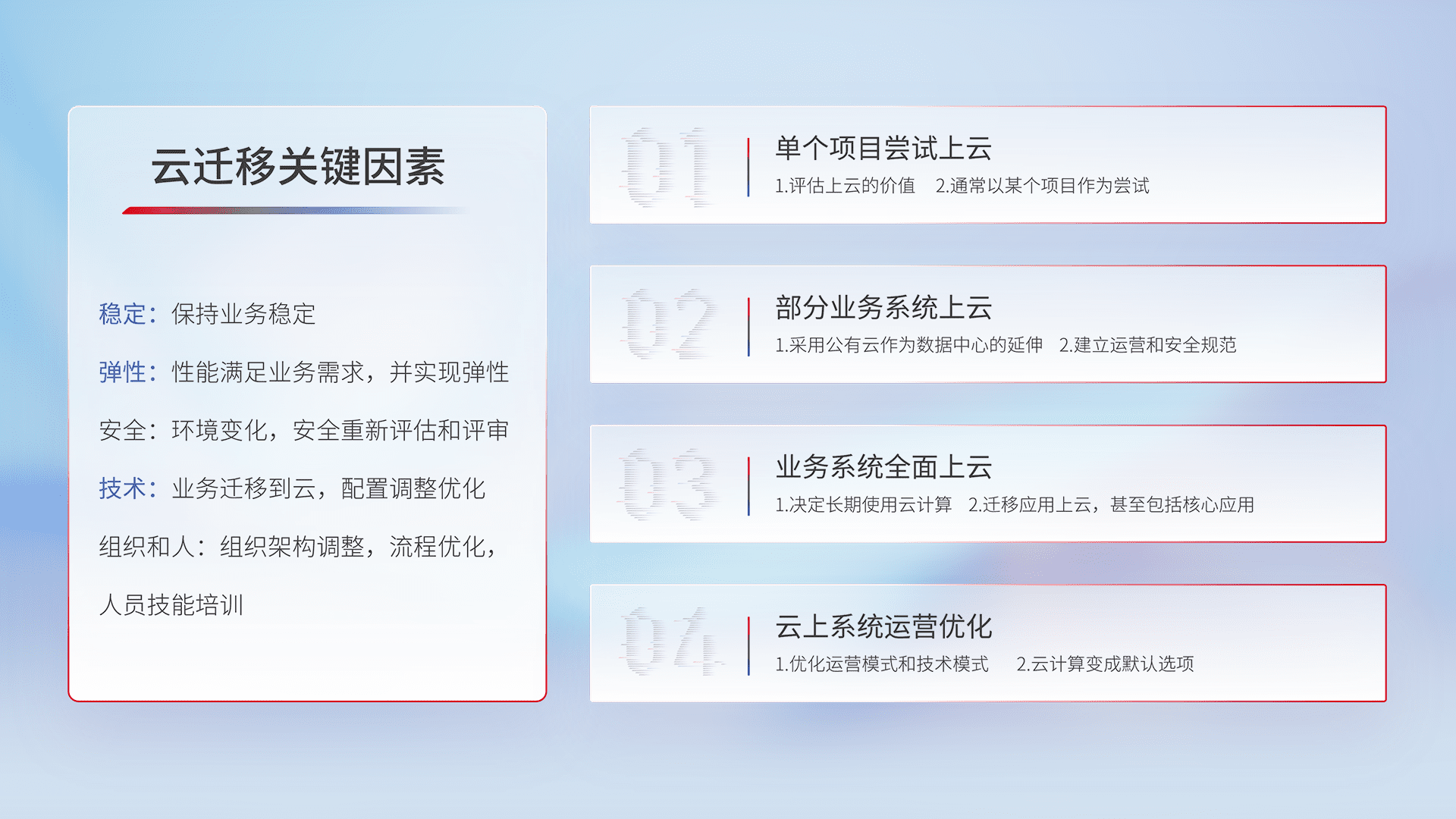 结合实际业务,,从规划设计、、、、云平台选型、、云原生改造、、数据迁移、、、、集成交付,,,迁移全过程为客户识别最佳上云路径,,,做好风险识别管理,,,,设计网络架构、、、、身份权限、、、、安全审计合规、、、操作审计、、、、日志审计、、监控告警策略、、、多站点容灾设计等,,对云上基础设施进行整体规划,,,,提升IT治理水平,,,以满足弹性、、、、高可用、、、高性能的需求。。。
