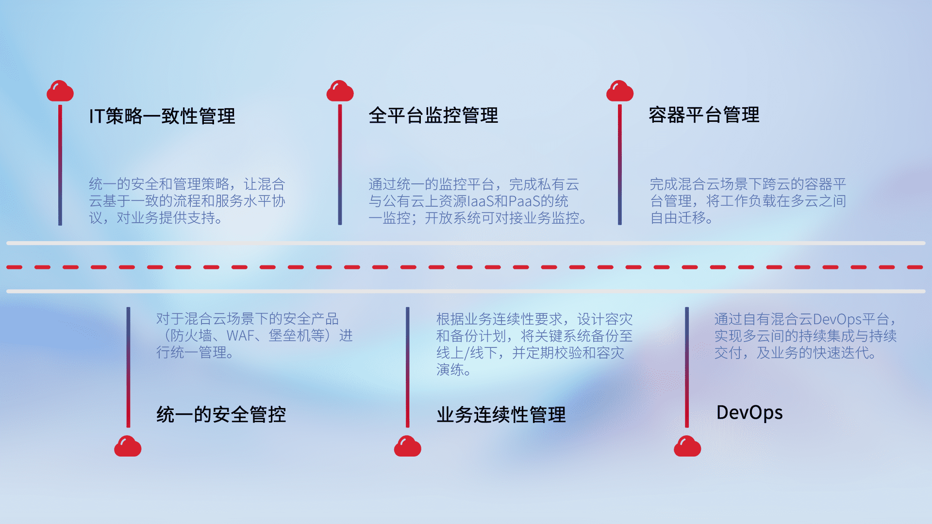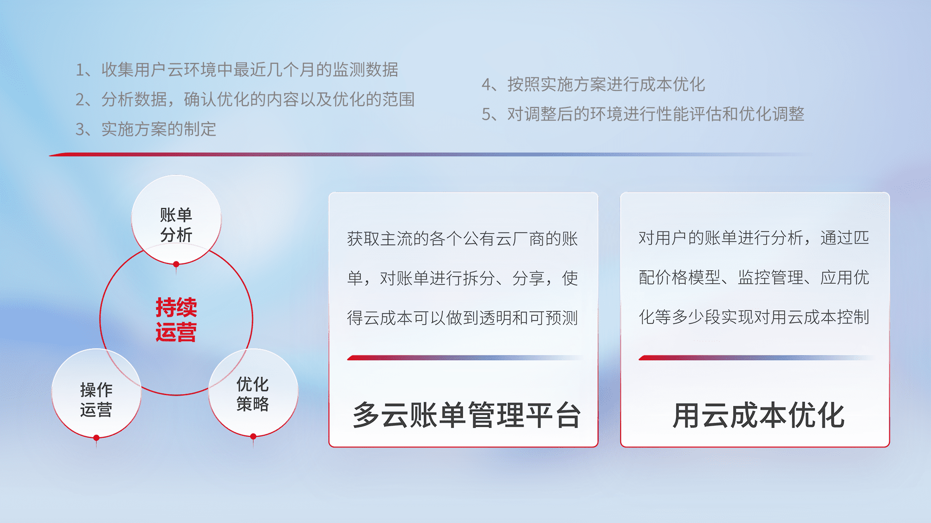 通过多云纳管,,,,以统一的资源数据模型把客户的云资源进行抽象和封装,,,进而实现对多云资源的统一操作,,,保障云资源管理的可靠性、、稳定性与可用性。。量身定制化运维内容,,配置、、开发运维、、补丁管理、、、、备份、、、监控、、、、认证和访问管理、、审计和日常巡检等,,保障在用云过程中的可靠度,,稳定度以及高可用率。。。