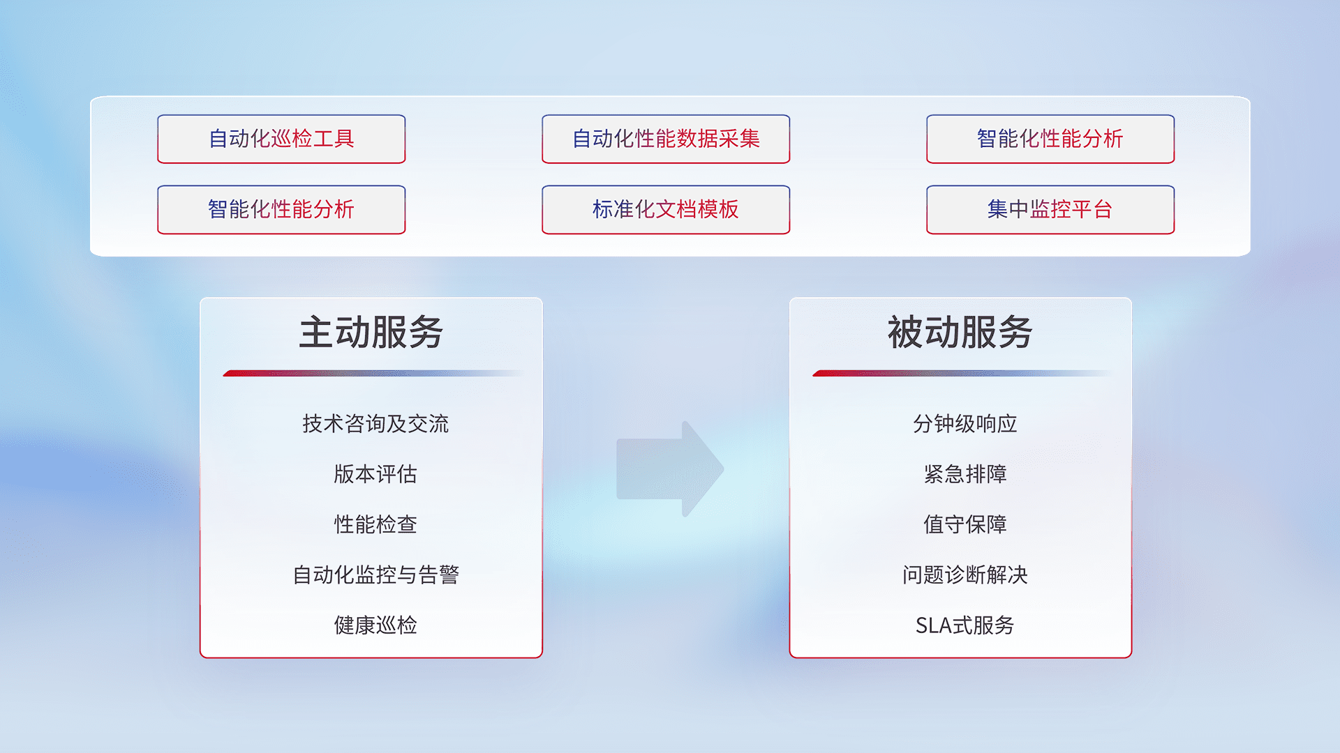 智能化工具和标准化文档,,保障服务质量,,,提供主动服务(包含技术咨询、、、版本评估、、性能检查、、自动化监控与告警、、、健康巡检)和被动服务包含(分钟级响应、、、紧急排障、、值守保障、、、、问题诊断解决、、SLA服务)。。。。
