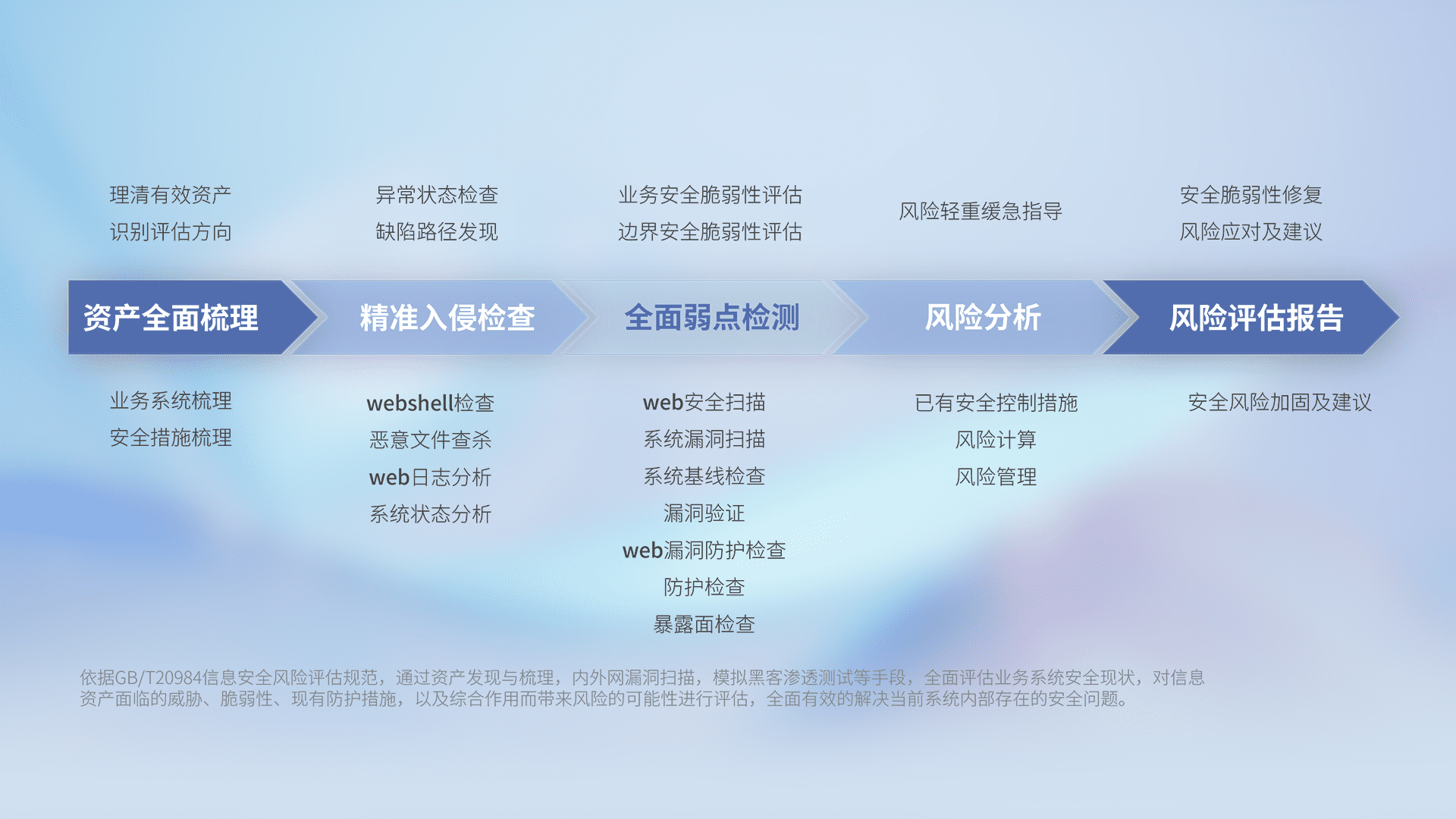 针对客户行业特性,,,,以专业的安全服务+多厂商联合解决方案提供专属的一站式安全管理服务,,,帮助客户全面感知网络空间威胁,,,,基于识别、、、、检测、、、、分析、、防护、、、监测、、响应的服务理论模型,,,,从方案咨询、、、、集成交付、、、、评估验证、、优化加固、、、、运维运营,,,致力于为客户提供完整的闭环管理式安全服务。。以实战经验为客户打造高抵御风险的安全体系,,,帮助客户发现威胁、、、、对抗威胁、、、、处置威胁,,不断积累安全对抗能力,,,持续保障数字化安全。。